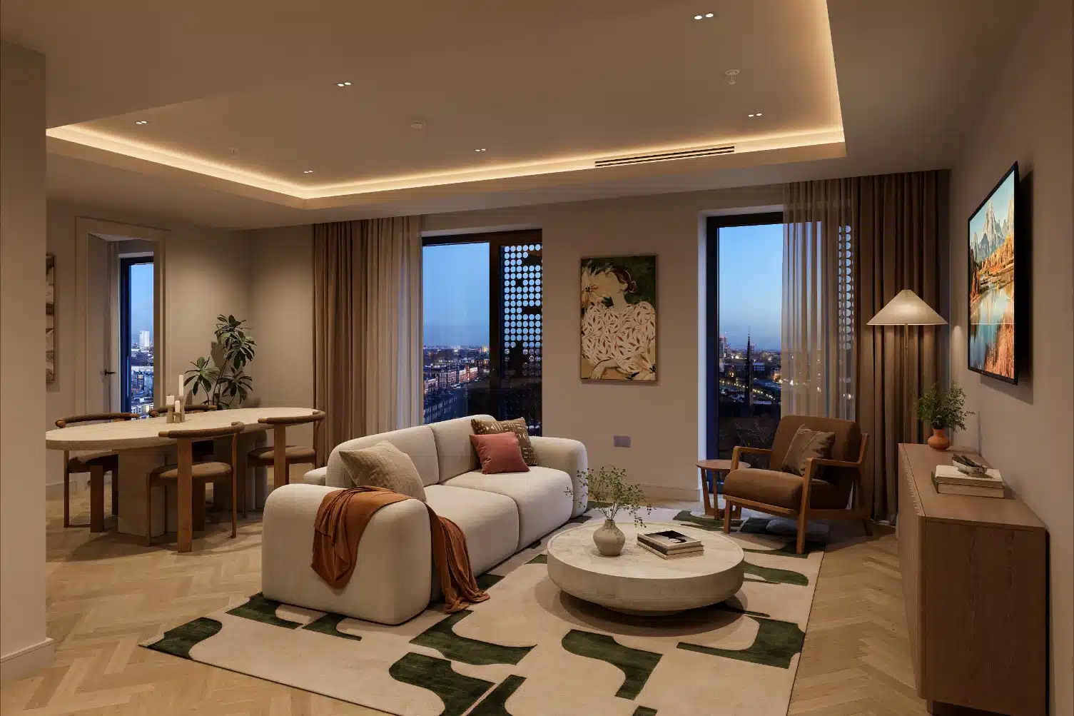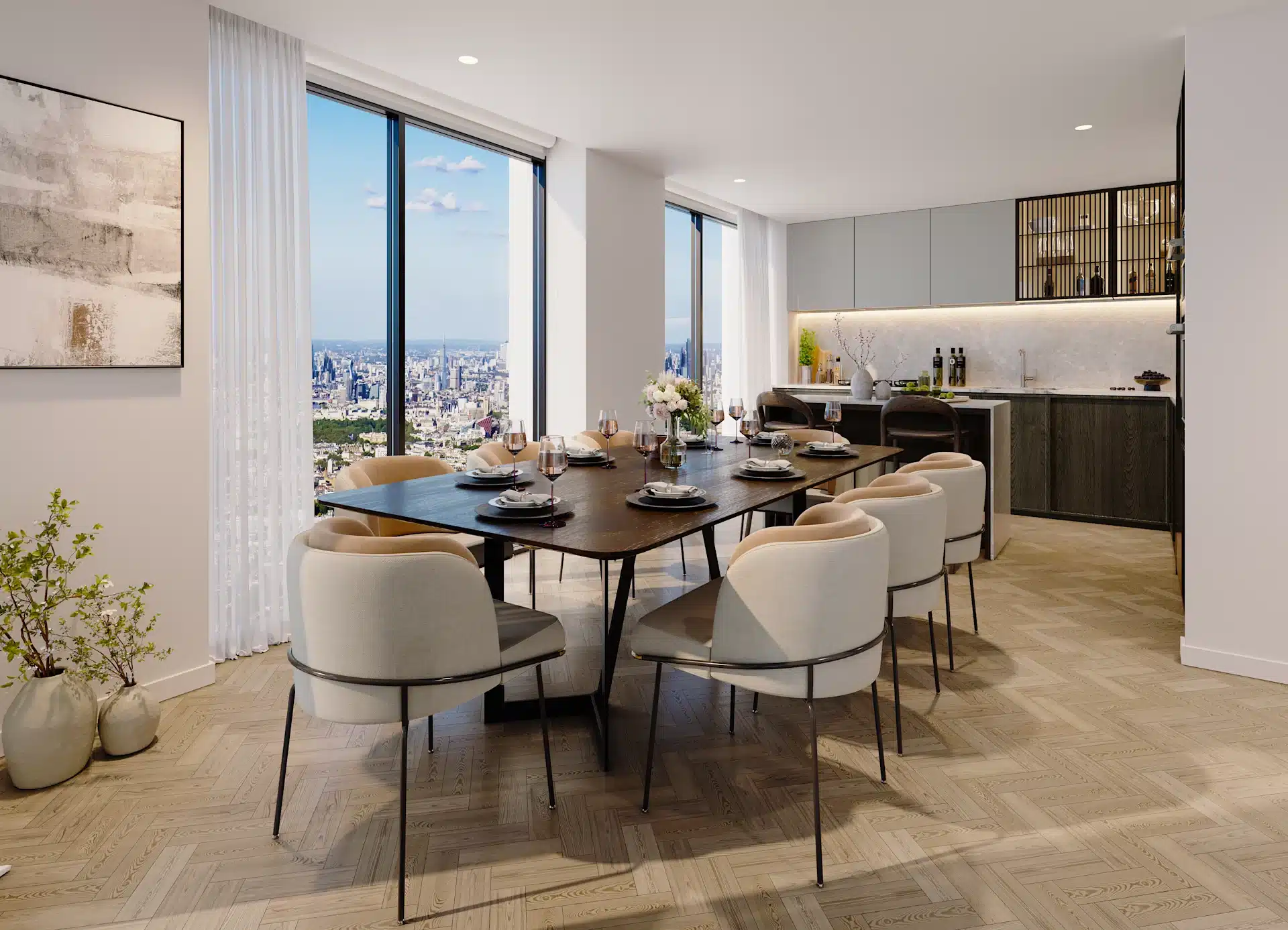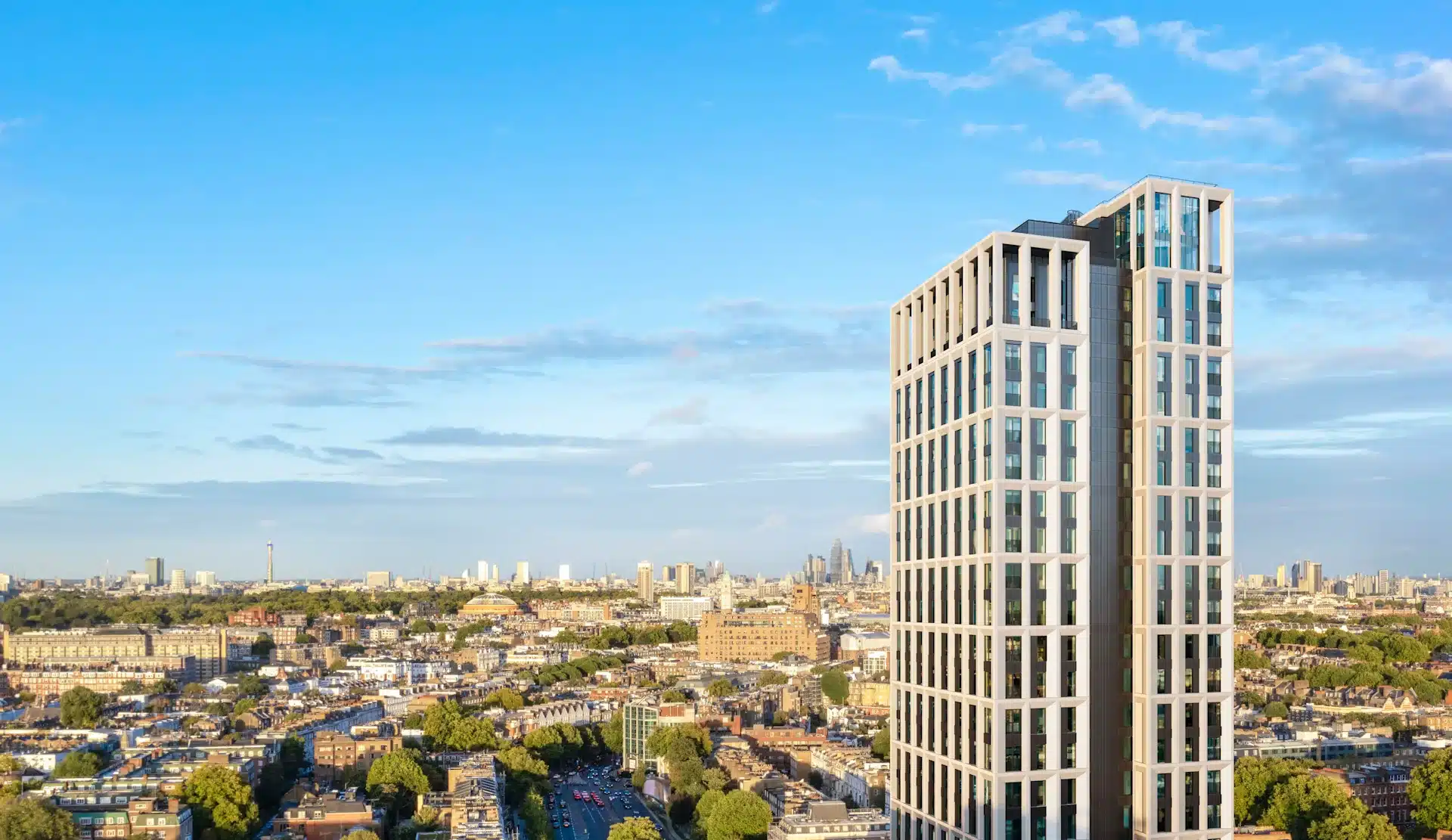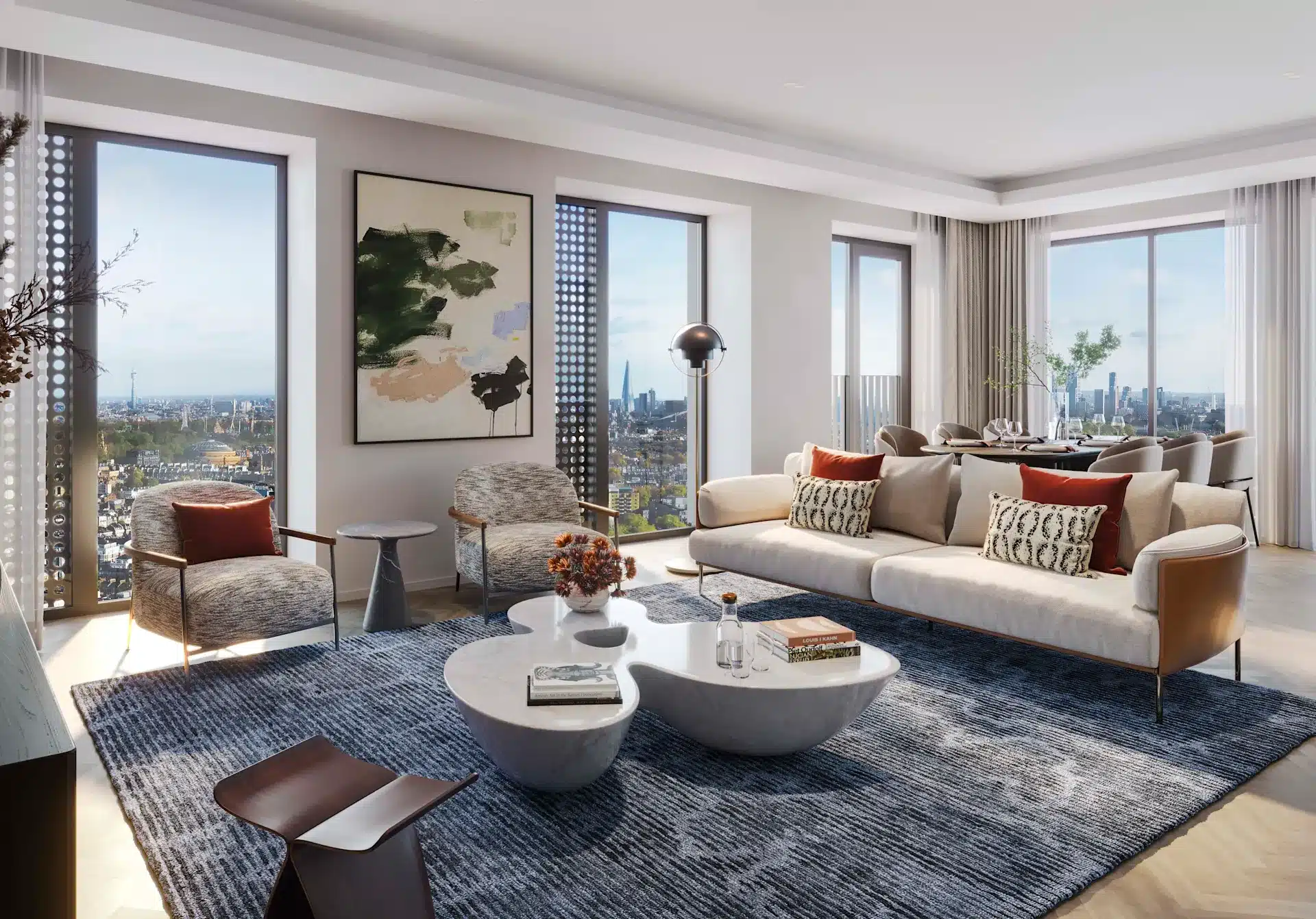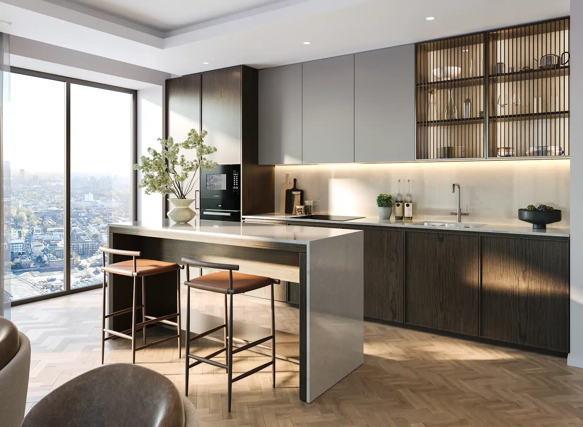 The Oria is the tallest residential tower in the Royal Borough of Kensington and Chelsea. Soaring 29 storeys with 129 apartments, the interiors are by Conran and Partners — herringbone timber flooring, coffered ceilings and floor-to-ceiling windows throughout. Every apartment has underfloor heating and comfort cooling as standard.